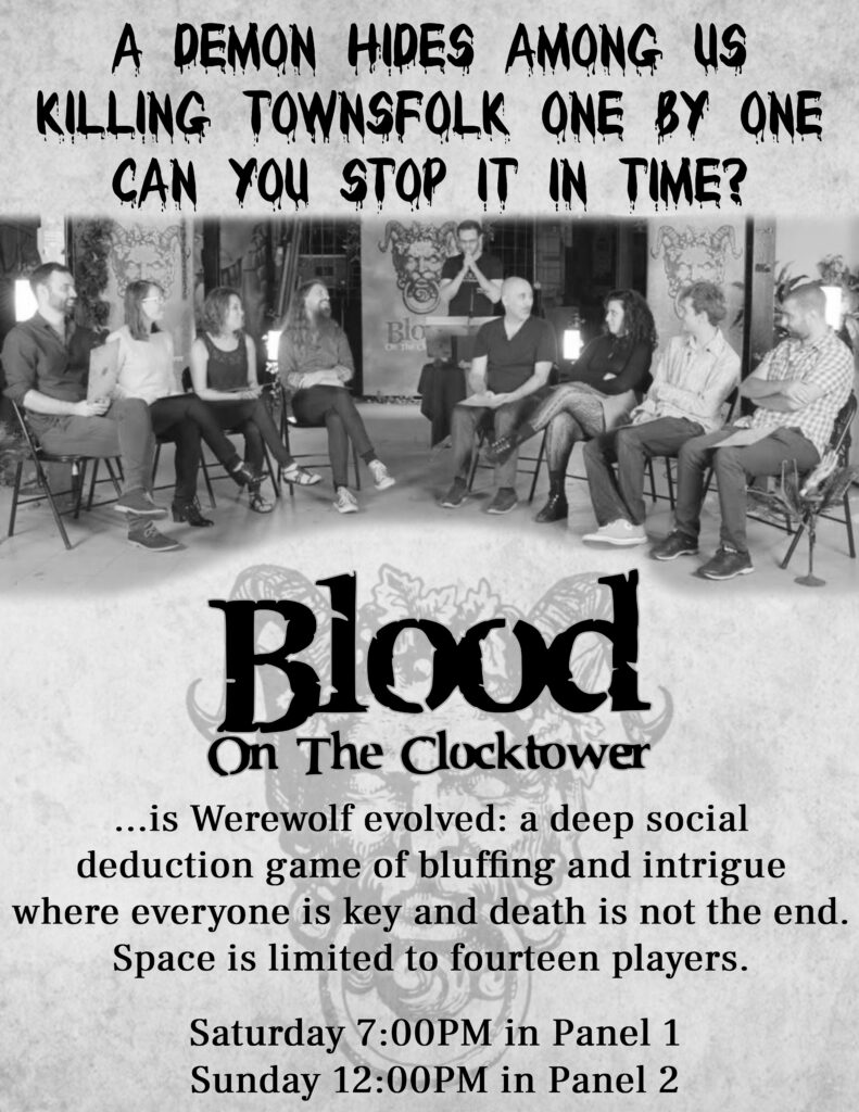 Blood on the Clocktower is an advanced bluffing and deduction game where players are randomly assigned secret identities; whether good townsfolk, strange outsiders, devious minions, or the demon itself. Good will win by tracking down the demon and executing it while Evil wins by eliminating all but one of the good players. Space is limited to 16 players and no previous experience is needed.